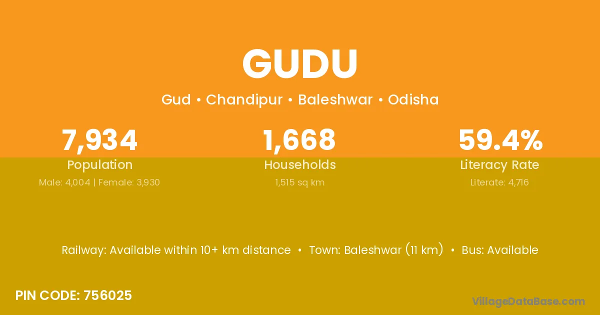 Baleshwar (11 km) is the nearest town to Gudu village for major economic activities and is located approximately 11 km away.