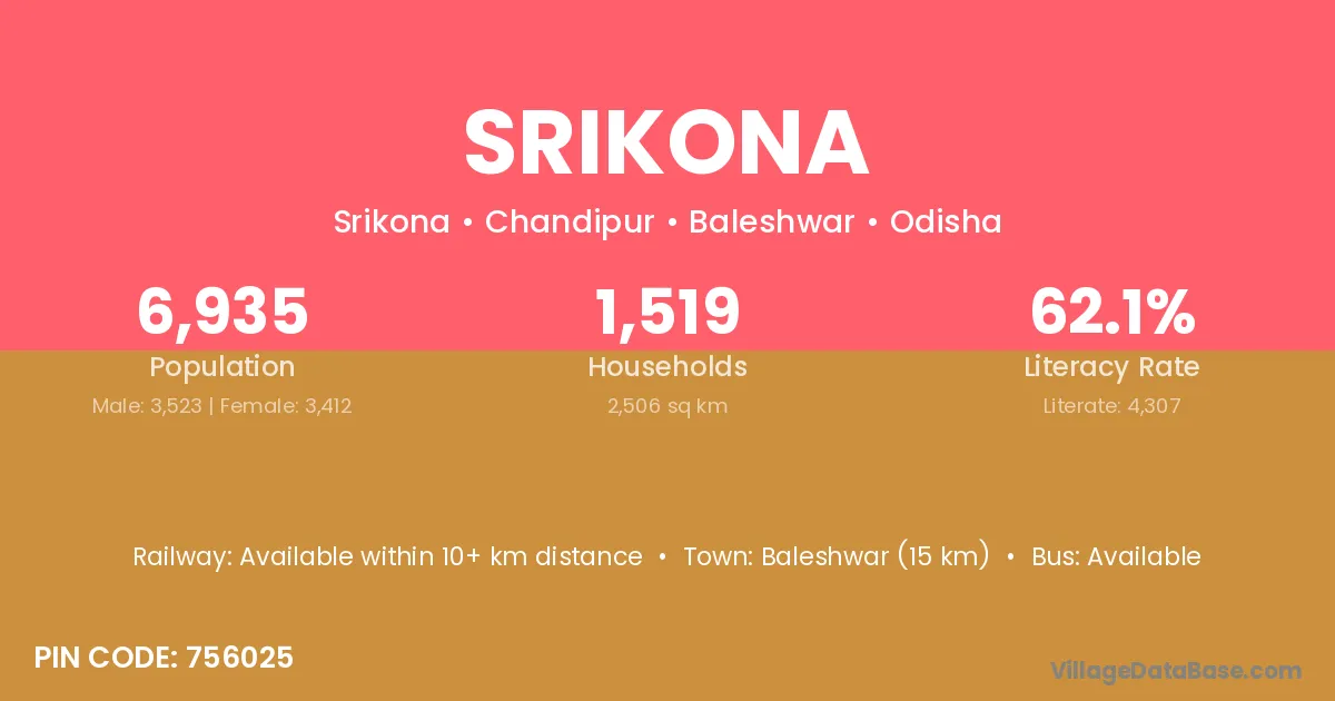 Baleshwar (15 km) is the nearest town to Srikona village for major economic activities and is located approximately 15 km away.