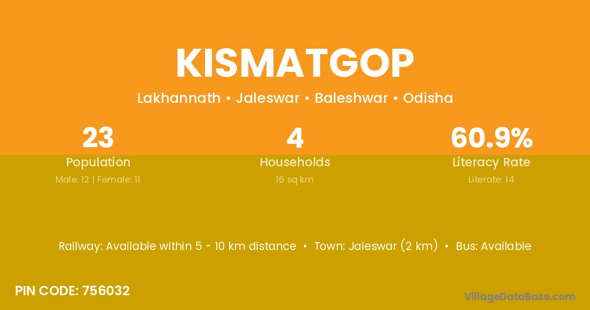 Jaleswar (2 km) is the nearest town to Kismatgop village for major economic activities and is located approximately 2 km away.