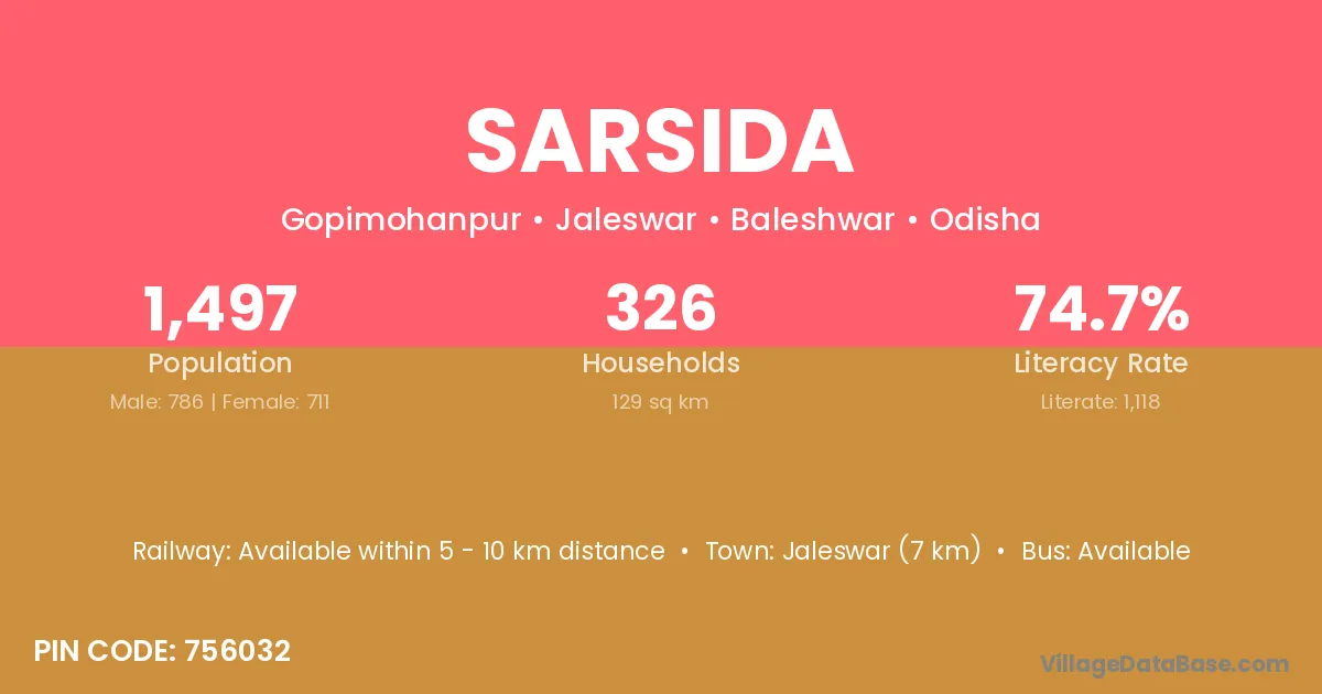 Jaleswar (7 km) is the nearest town to Sarsida village for major economic activities and is located approximately 7 km away.