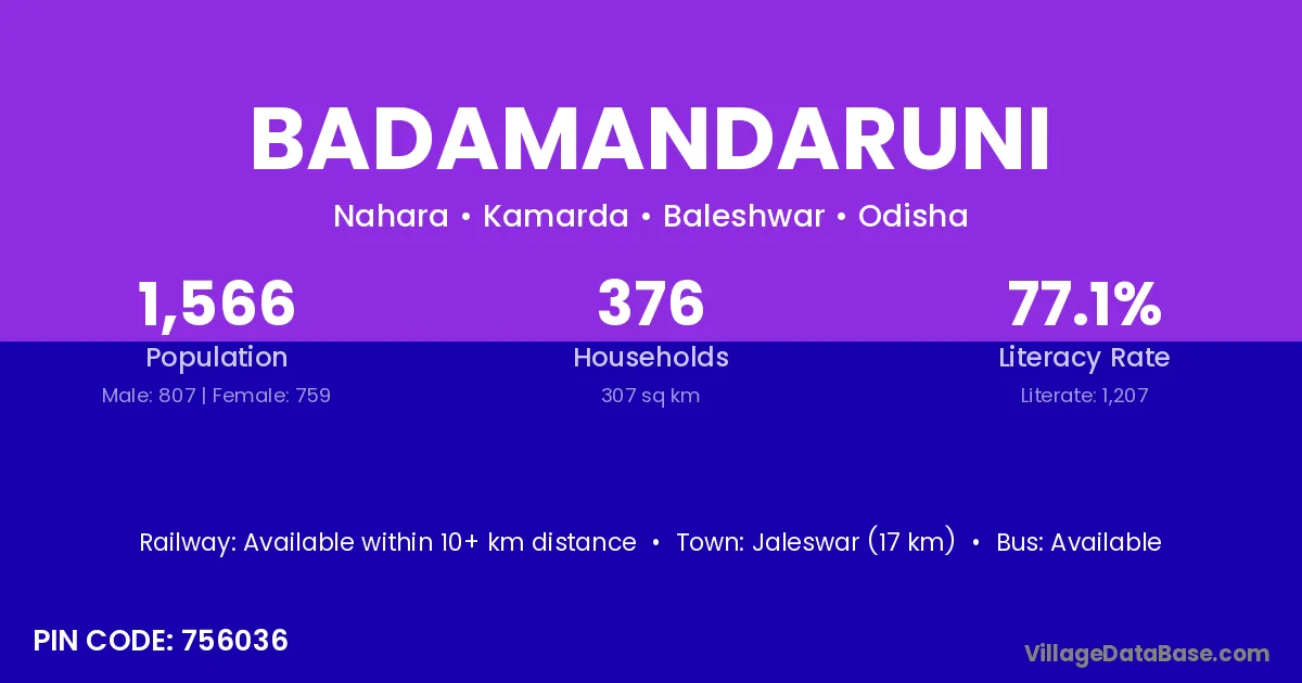 Jaleswar (17 km) is the nearest town to Badamandaruni village for major economic activities and is located approximately 17 km away.