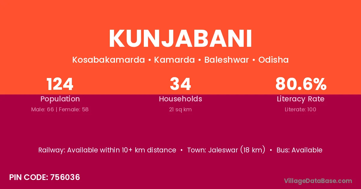 Jaleswar (18 km) is the nearest town to Kunjabani village for major economic activities and is located approximately 18 km away.