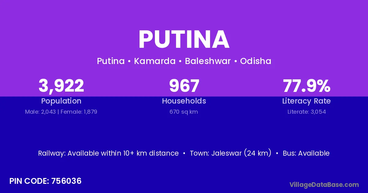 Jaleswar (24 km) is the nearest town to Putina village for major economic activities and is located approximately 24 km away.