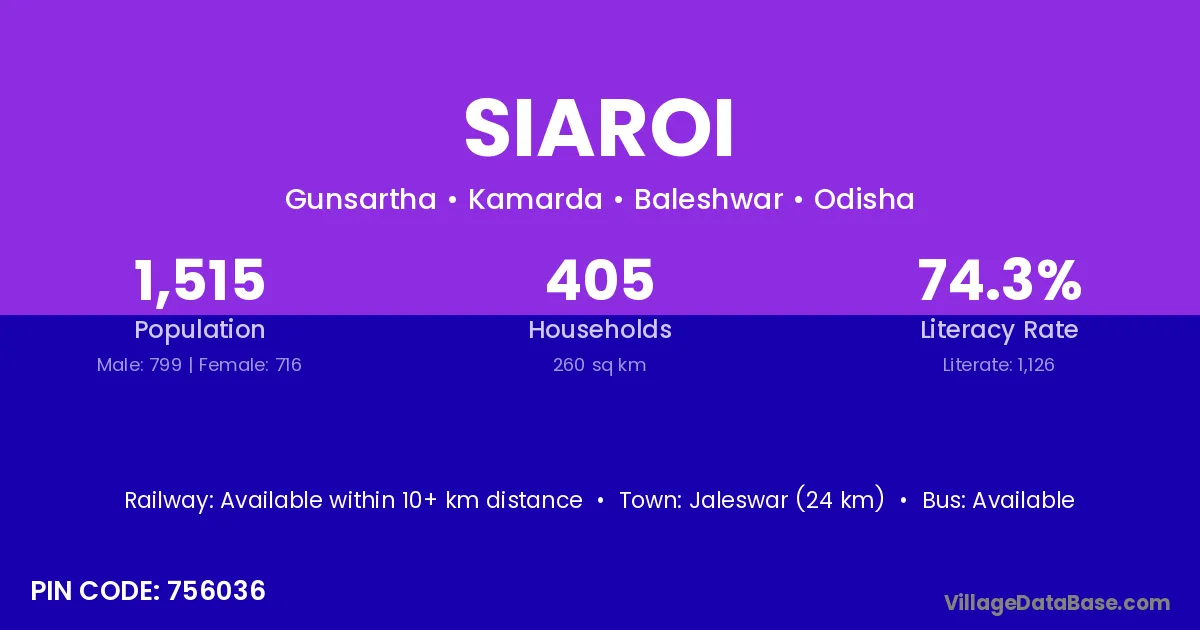 Jaleswar (24 km) is the nearest town to Siaroi village for major economic activities and is located approximately 24 km away.