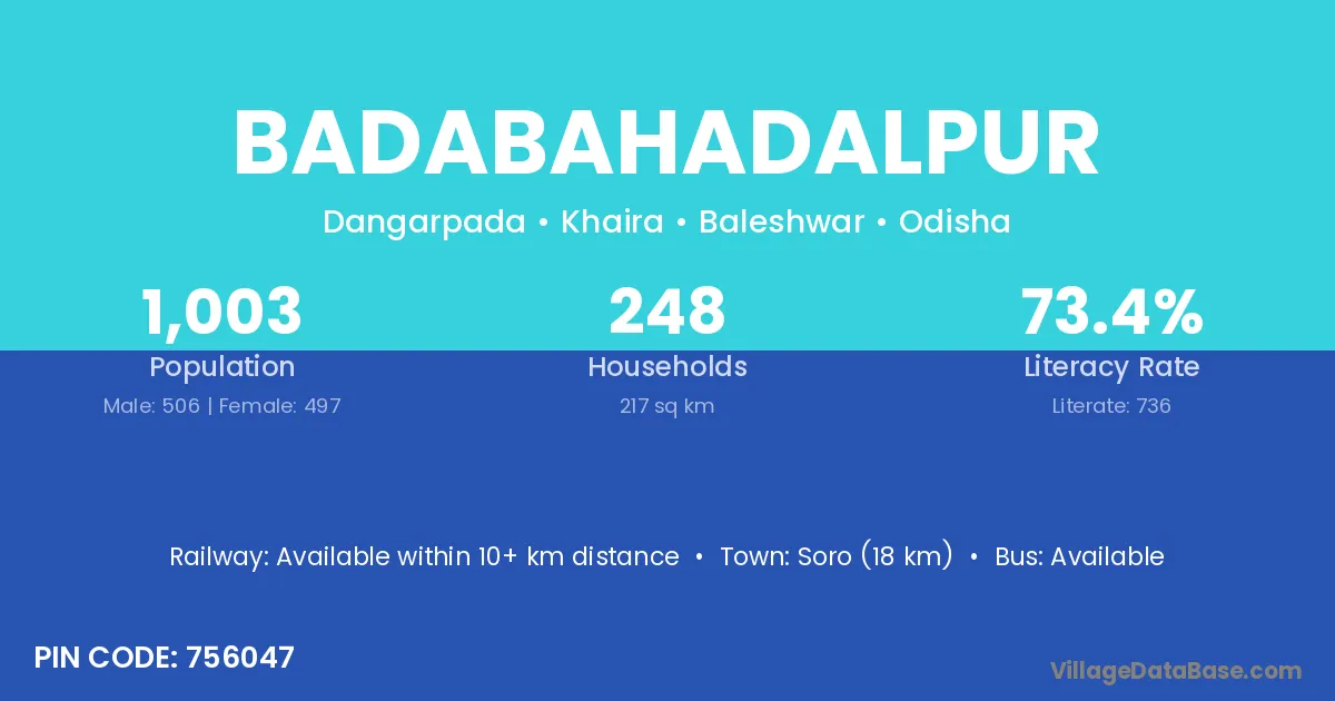 Soro (18 km) is the nearest town to Badabahadalpur village for major economic activities and is located approximately 18 km away.