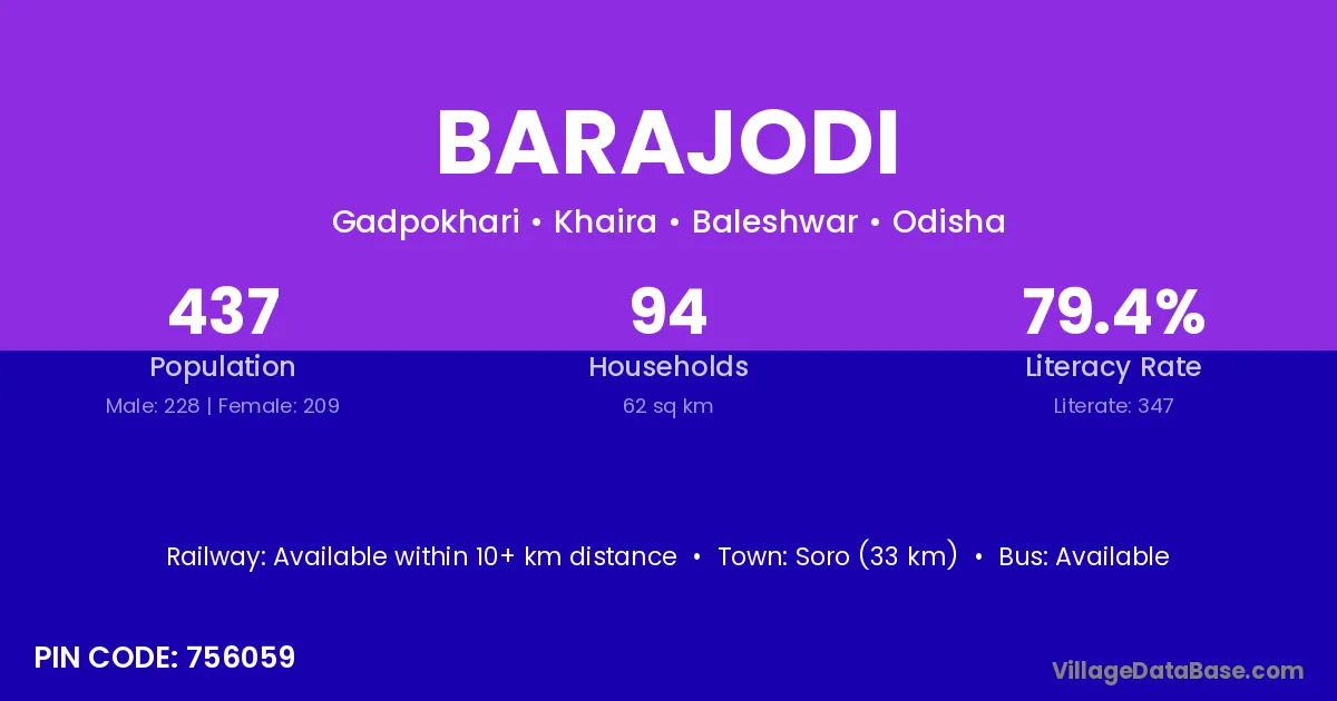 Soro (33 km) is the nearest town to Barajodi village for major economic activities and is located approximately 33 km away.