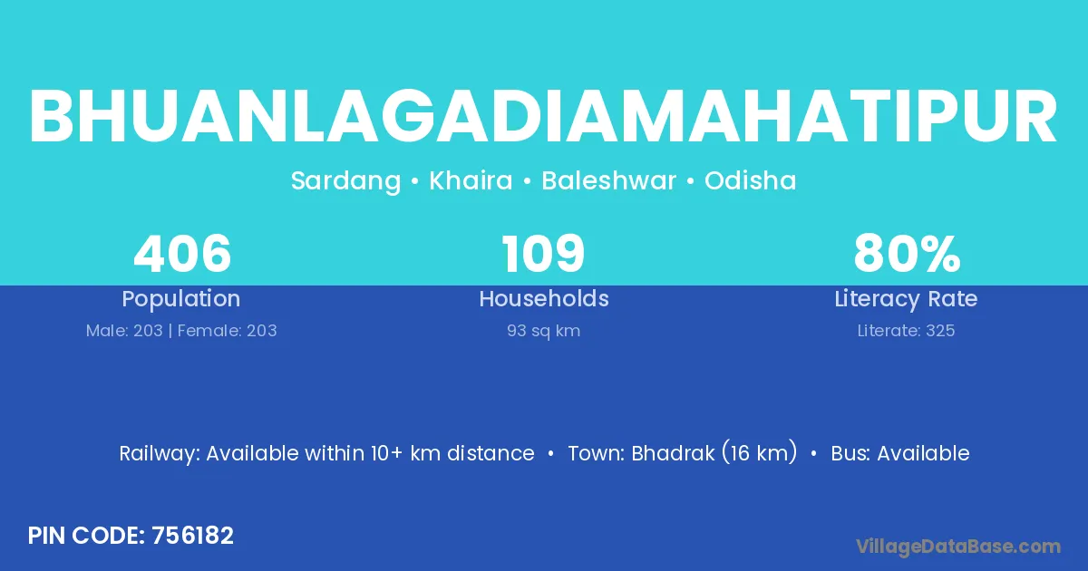 Bhuanlagadiamahatipur village has a total population of 406 people, of which 203 are males and 203 are females.