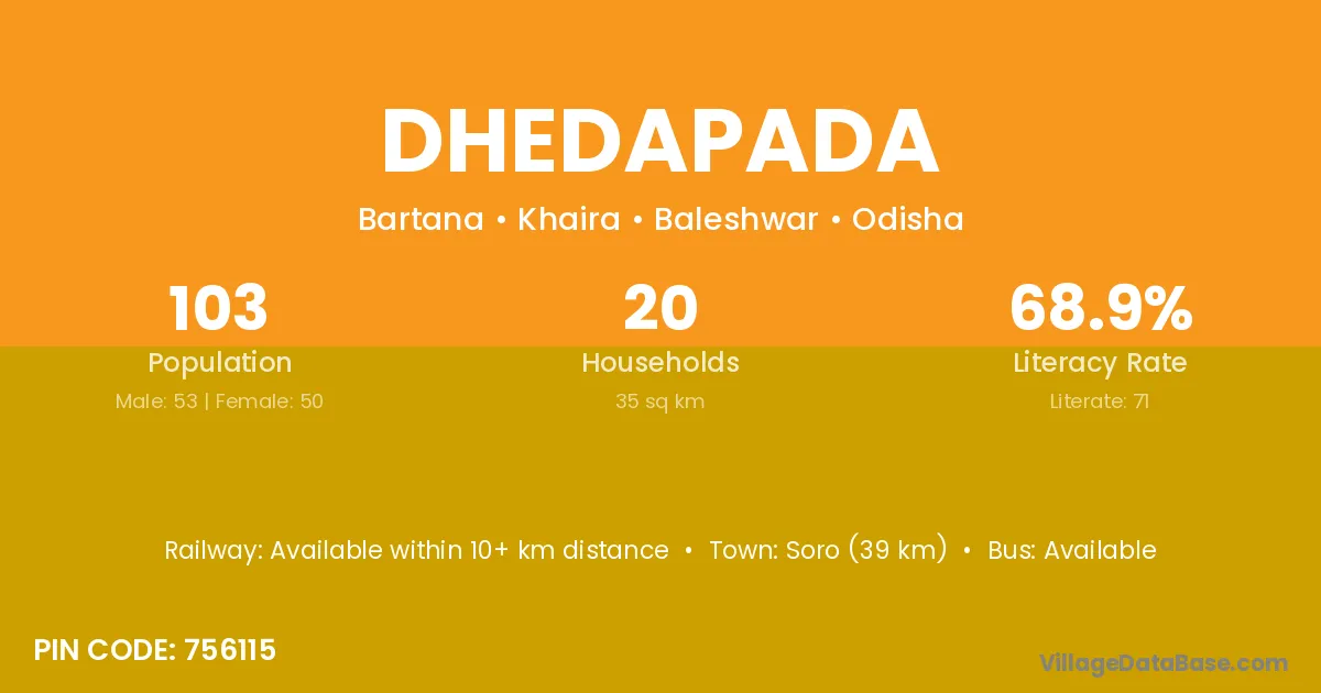 Soro (39 km) is the nearest town to Dhedapada village for major economic activities and is located approximately 39 km away.