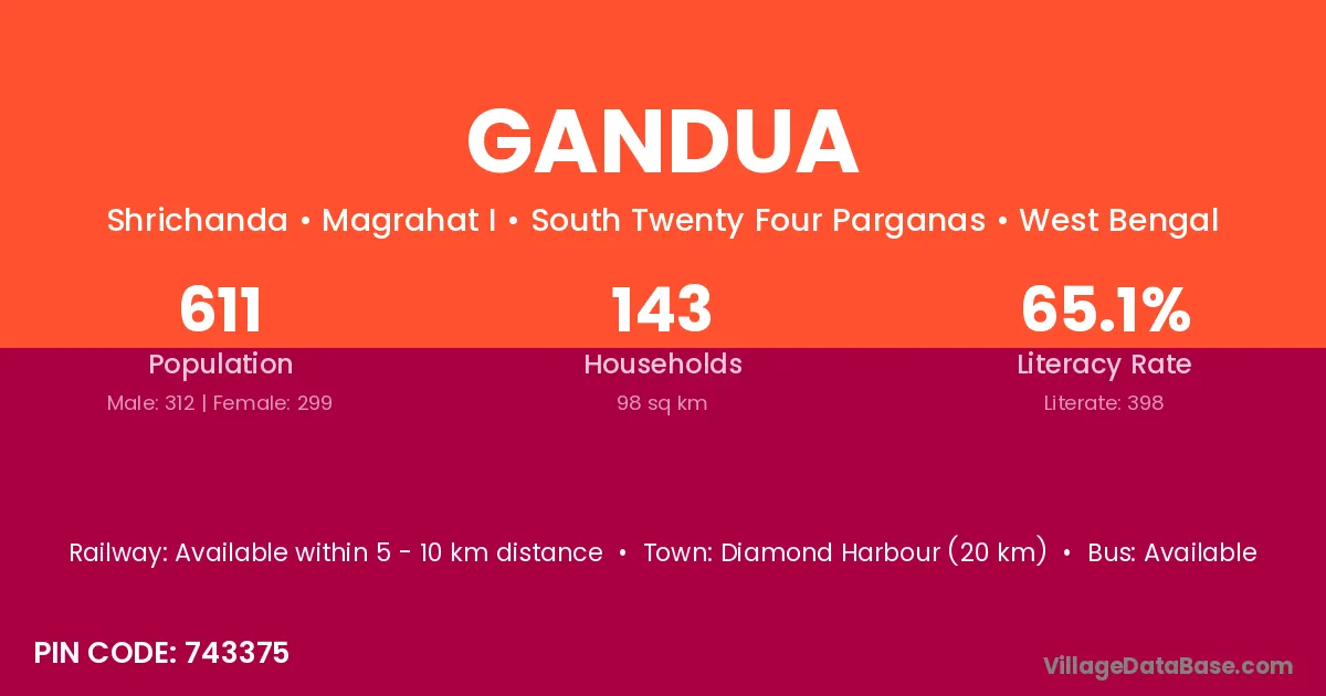 Soro (18 km) is the nearest town to Gandua village for major economic activities and is located approximately 18 km away.