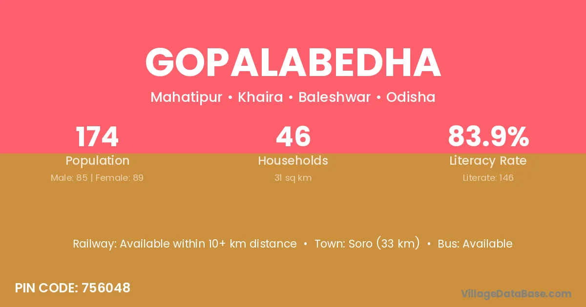 Soro (33 km) is the nearest town to Gopalabedha village for major economic activities and is located approximately 33 km away.