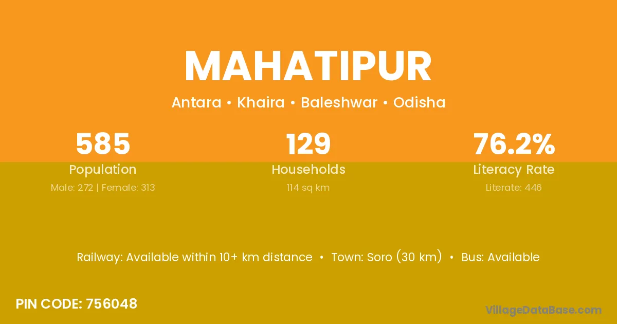 Soro (30 km) is the nearest town to Mahatipur village for major economic activities and is located approximately 30 km away.