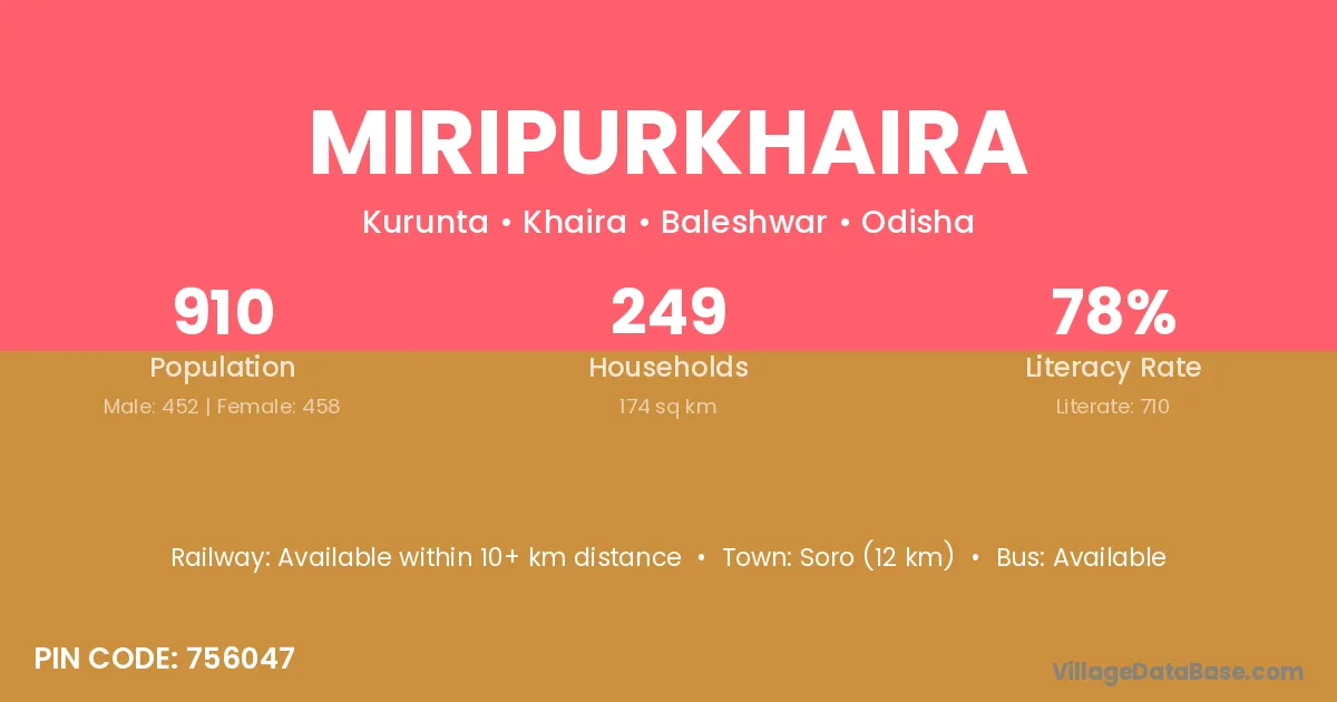 Soro (12 km) is the nearest town to Miripurkhaira village for major economic activities and is located approximately 12 km away.