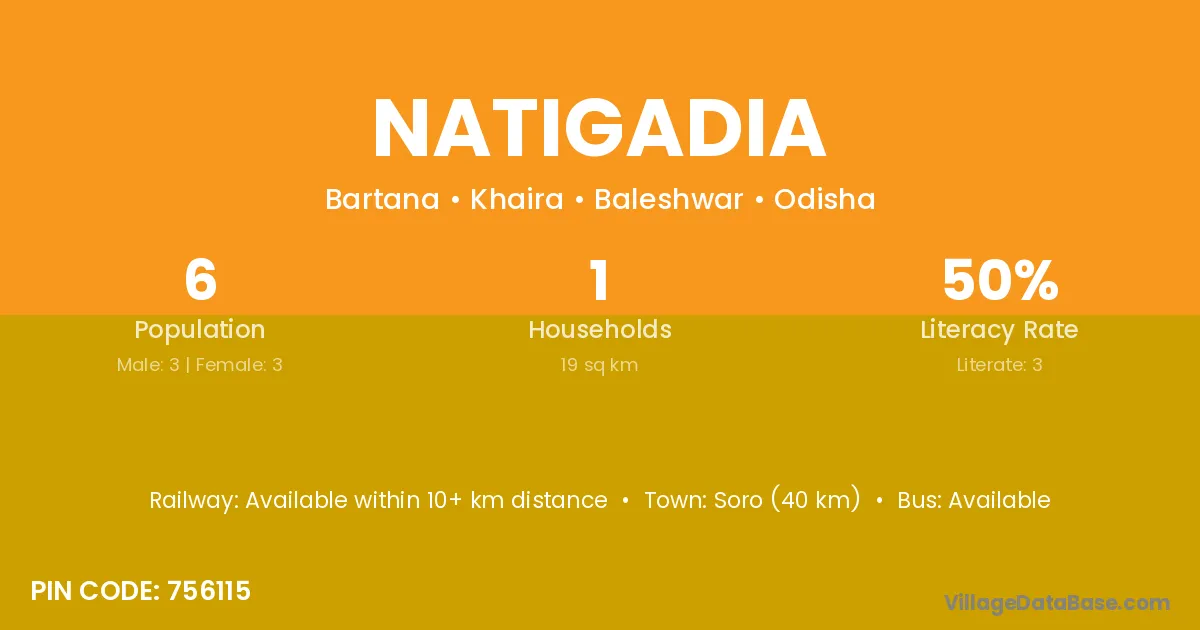 Natigadia village has a total population of 6 people, of which 3 are males and 3 are females.