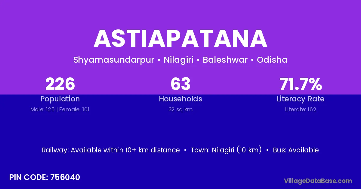 Nilagiri (10 km) is the nearest town to Astiapatana village for major economic activities and is located approximately 10 km away.