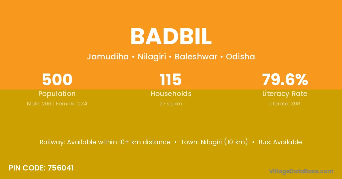 Nilagiri (10 km) is the nearest town to Badbil village for major economic activities and is located approximately 10 km away.