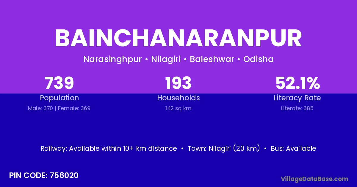 Nilagiri (20 km) is the nearest town to Bainchanaranpur village for major economic activities and is located approximately 20 km away.