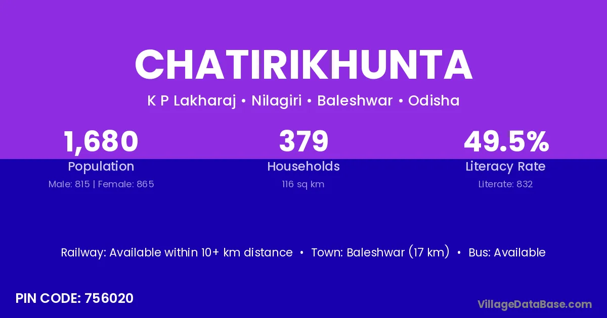 Baleshwar (17 km) is the nearest town to Chatirikhunta village for major economic activities and is located approximately 17 km away.