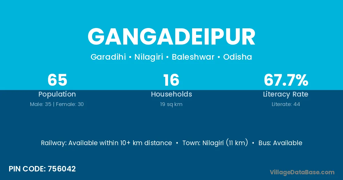 Nilagiri (11 km) is the nearest town to Gangadeipur village for major economic activities and is located approximately 11 km away.