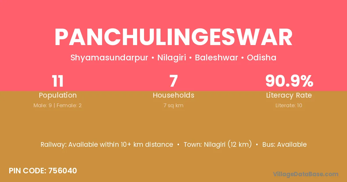 Nilagiri (12 km) is the nearest town to Panchulingeswar village for major economic activities and is located approximately 12 km away.