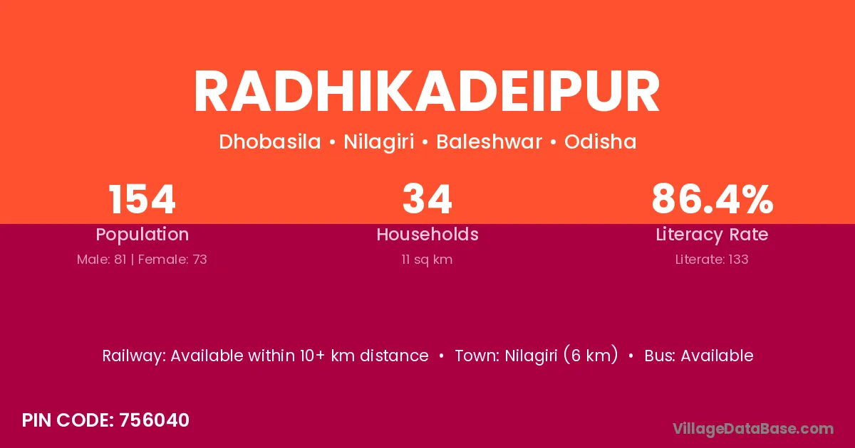 Nilagiri (6 km) is the nearest town to Radhikadeipur village for major economic activities and is located approximately 6 km away.