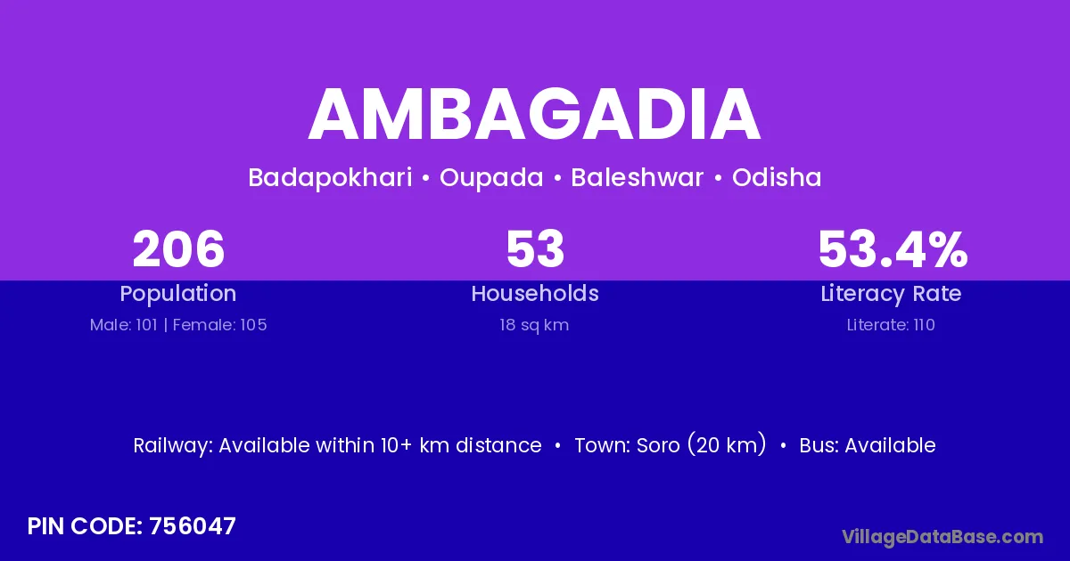 Ambagadia village has a total population of 206 people, of which 101 are males and 105 are females.