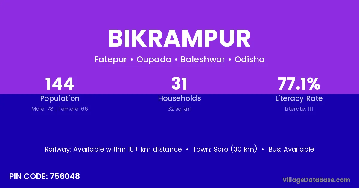 Soro (30 km) is the nearest town to Bikrampur village for major economic activities and is located approximately 30 km away.