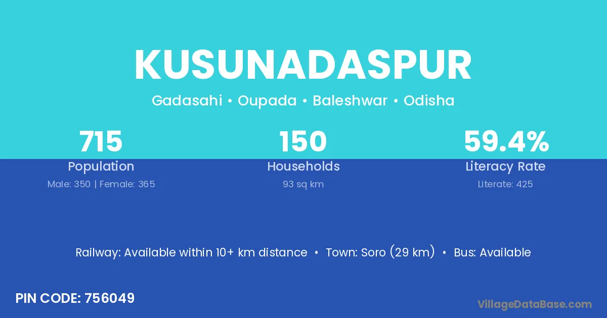 Kusunadaspur village has a total population of 715 people, of which 350 are males and 365 are females.