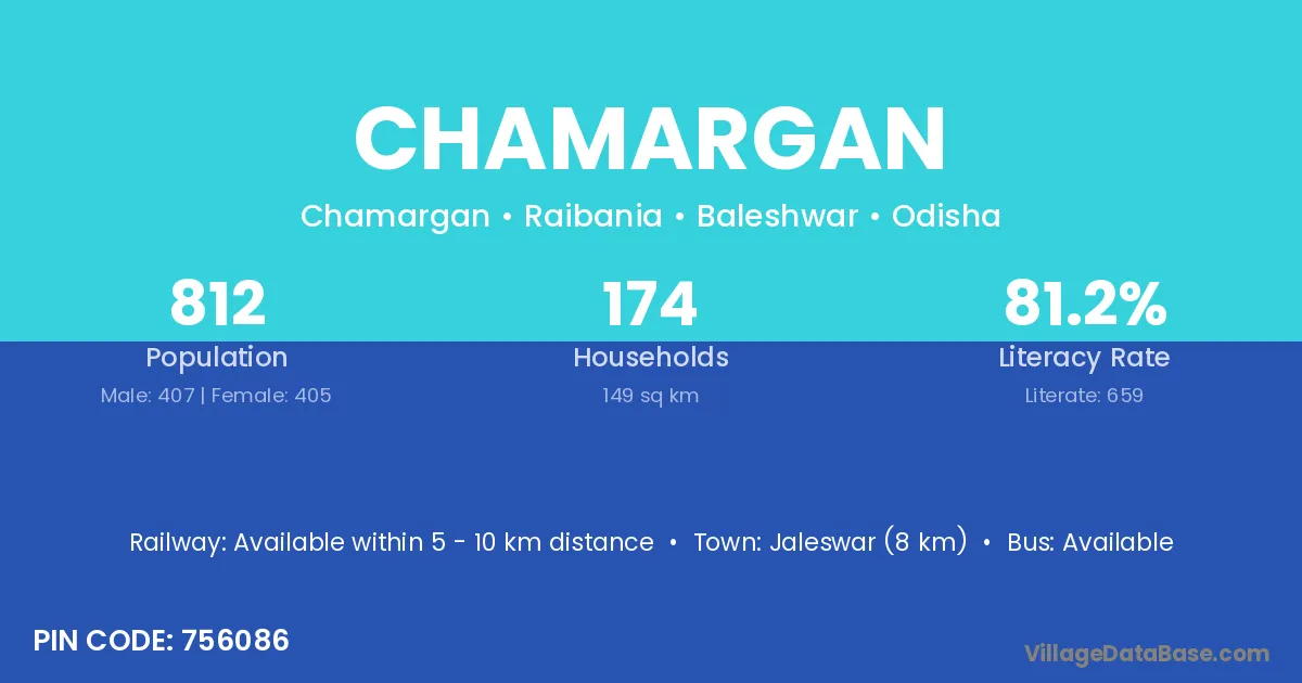 Jaleswar (8 km) is the nearest town to Chamargan village for major economic activities and is located approximately 8 km away.