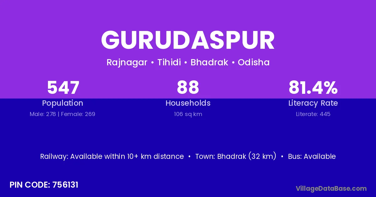 Jaleswar (10 km) is the nearest town to Gurudaspur village for major economic activities and is located approximately 10 km away.