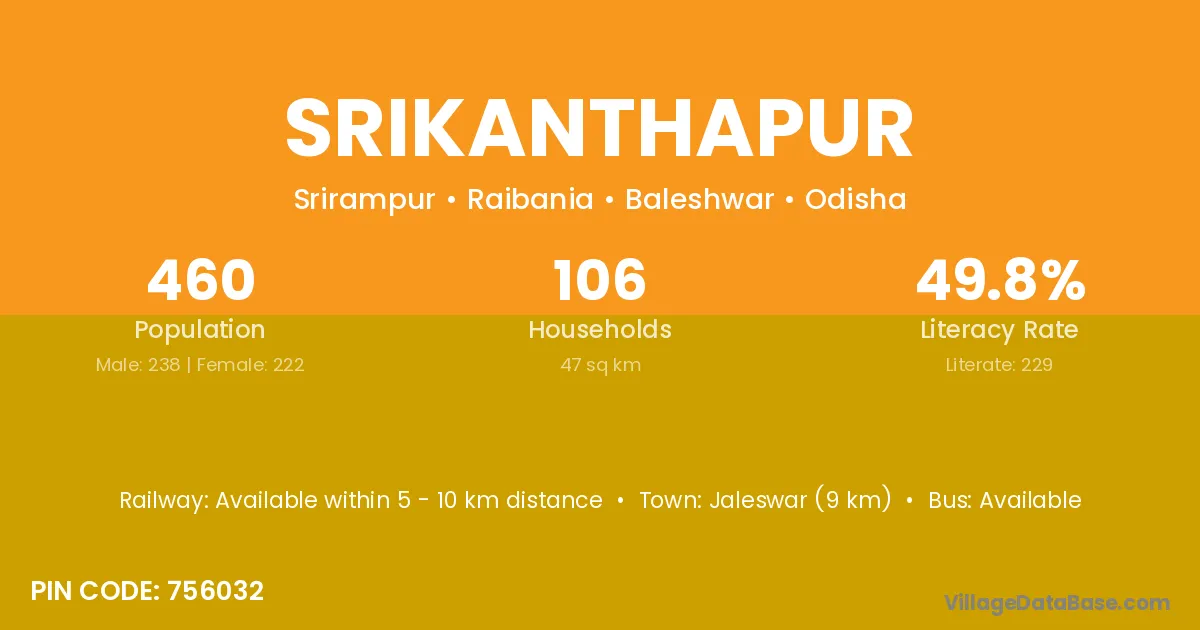 Jaleswar (9 km) is the nearest town to Srikanthapur village for major economic activities and is located approximately 9 km away.