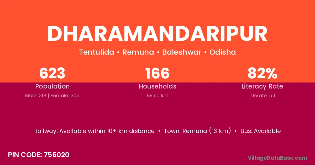 Remuna (13 km) is the nearest town to Dharamandaripur village for major economic activities and is located approximately 13 km away.