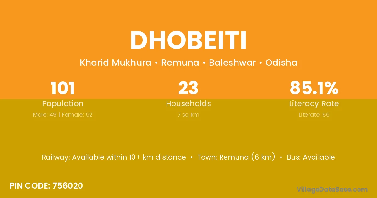 Remuna (6 km) is the nearest town to Dhobeiti village for major economic activities and is located approximately 6 km away.