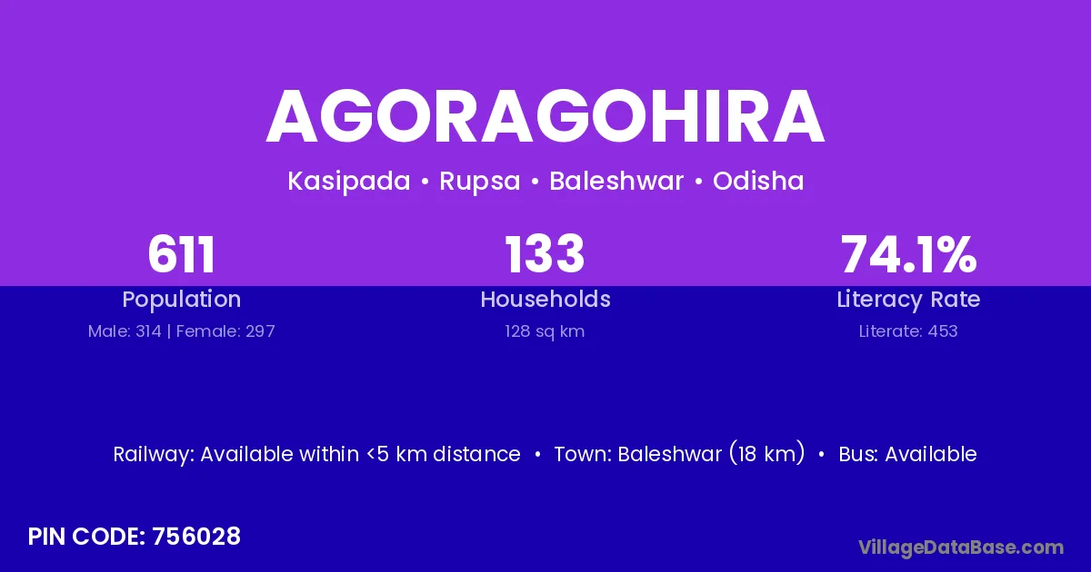 Baleshwar (18 km) is the nearest town to Agoragohira village for major economic activities and is located approximately 18 km away.