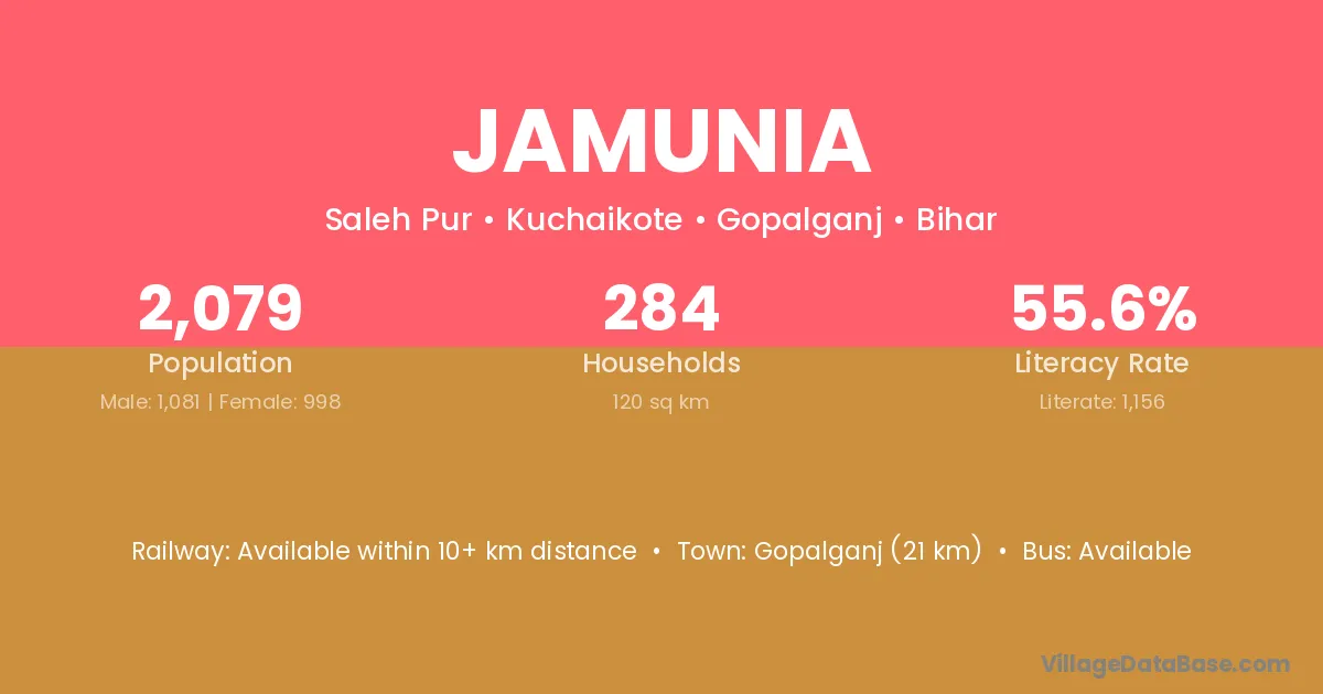 The literacy rate of Jamunia village is 57.89%. Male literacy stands at 65.46% and female literacy at 49.54%.