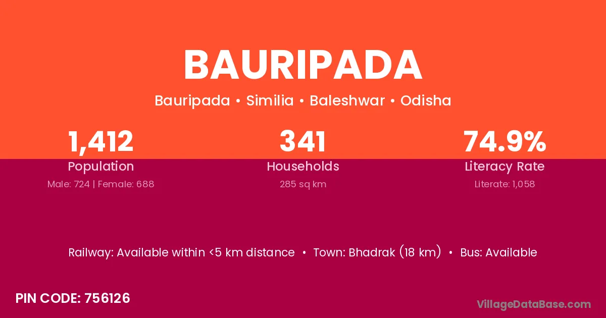 Bhadrak (18 km) is the nearest town to Bauripada village for major economic activities and is located approximately 18 km away.
