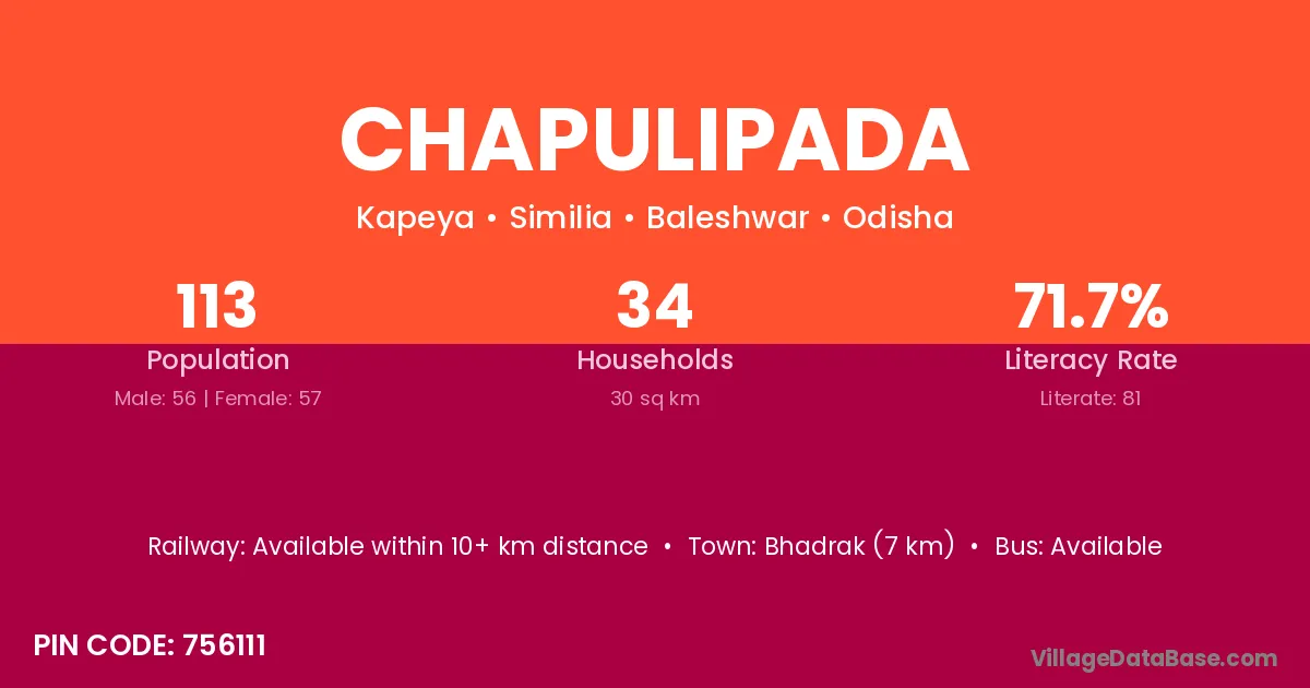 Chapulipada village has a total population of 113 people, of which 56 are males and 57 are females.