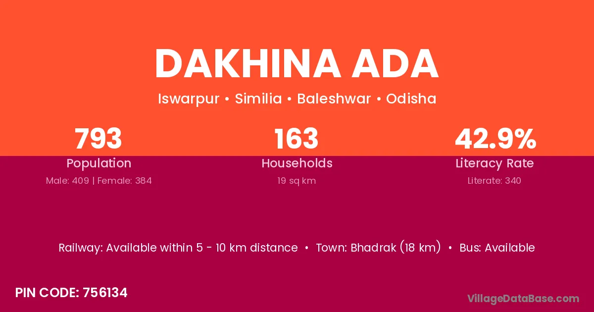 Bhadrak (18 km) is the nearest town to Dakhina Ada village for major economic activities and is located approximately 18 km away.