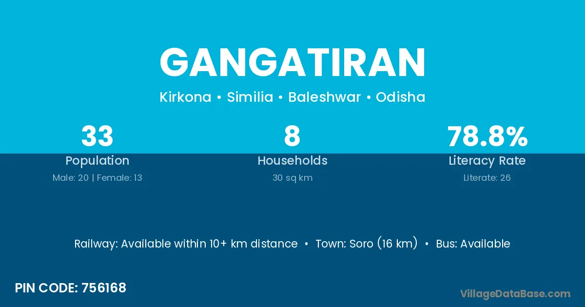 Soro (16 km) is the nearest town to Gangatiran village for major economic activities and is located approximately 16 km away.