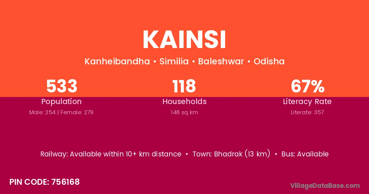 Bhadrak (13 km) is the nearest town to Kainsi village for major economic activities and is located approximately 13 km away.