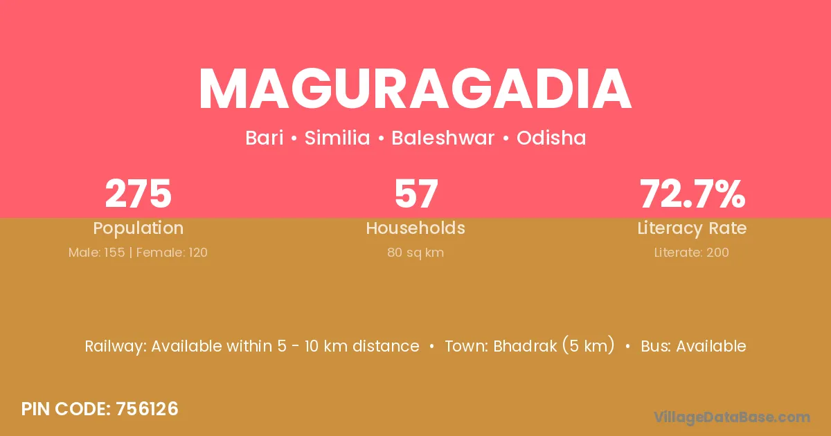 Maguragadia village has a total population of 275 people, of which 155 are males and 120 are females.