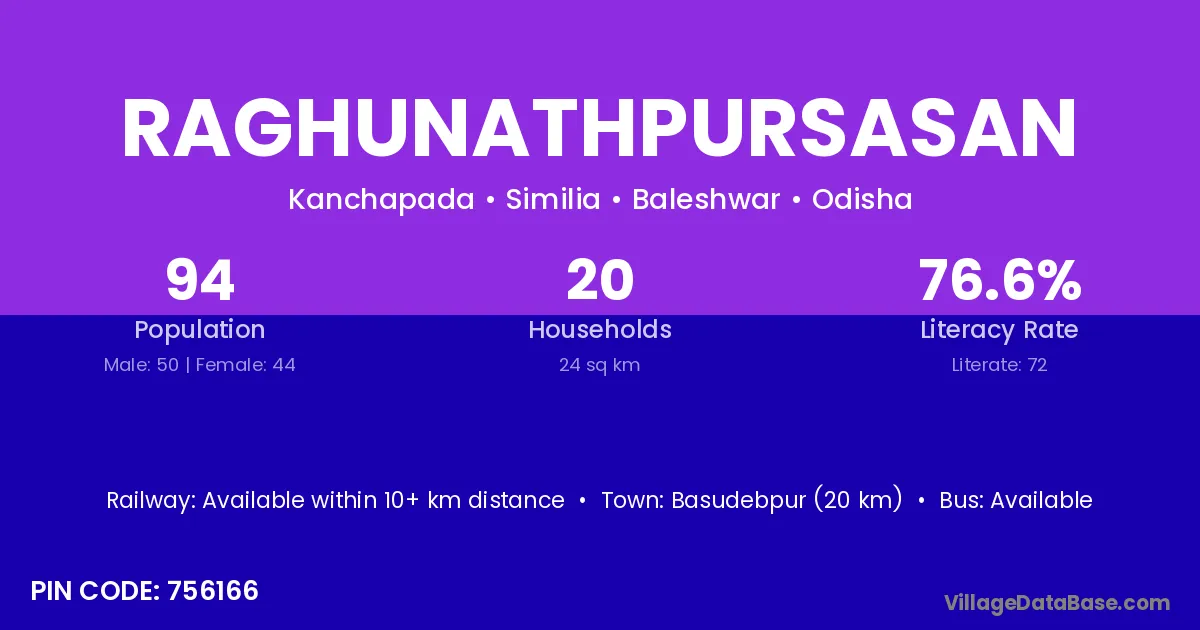 Raghunathpursasan village has a total population of 94 people, of which 50 are males and 44 are females.