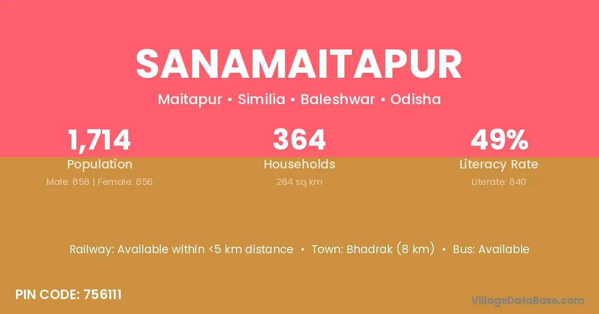 Bhadrak (8 km) is the nearest town to Sanamaitapur village for major economic activities and is located approximately 8 km away.