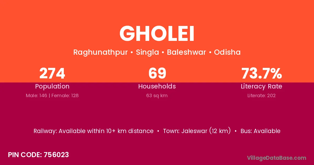 Jaleswar (12 km) is the nearest town to Gholei village for major economic activities and is located approximately 12 km away.