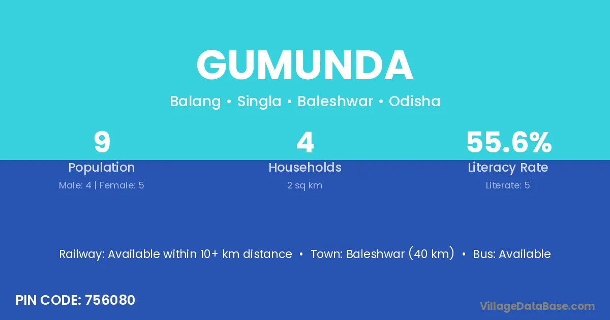 Baleshwar (40 km) is the nearest town to Gumunda village for major economic activities and is located approximately 40 km away.