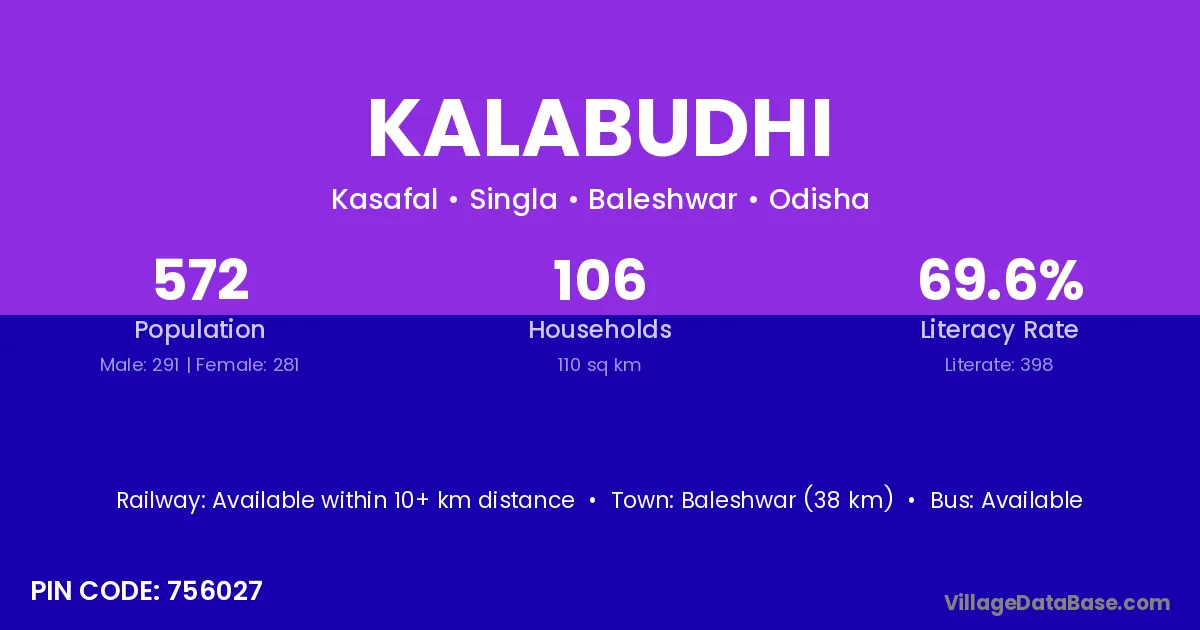 Baleshwar (38 km) is the nearest town to Kalabudhi village for major economic activities and is located approximately 38 km away.