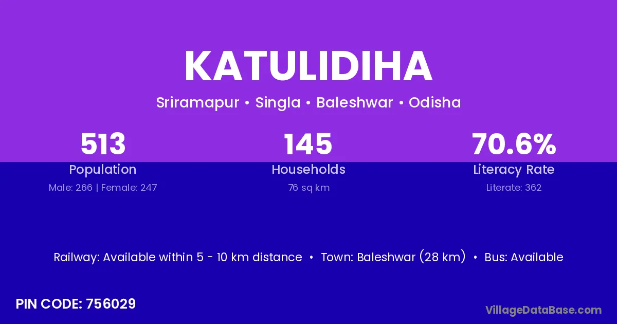 Baleshwar (28 km) is the nearest town to Katulidiha village for major economic activities and is located approximately 28 km away.
