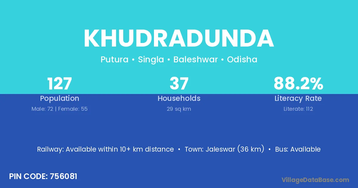 Jaleswar (36 km) is the nearest town to Khudradunda village for major economic activities and is located approximately 36 km away.