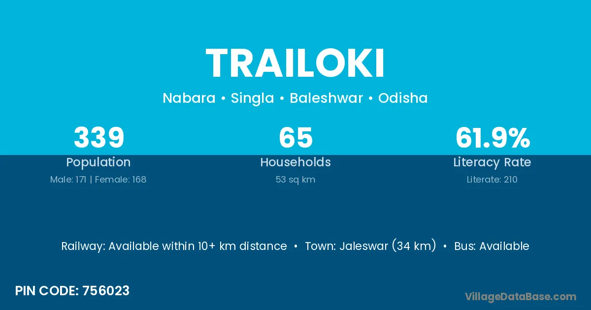 Jaleswar (34 km) is the nearest town to Trailoki village for major economic activities and is located approximately 34 km away.