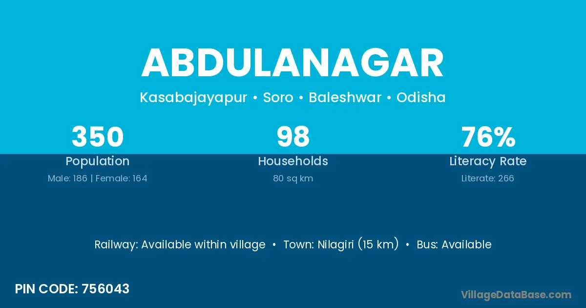 Nilagiri (15 km) is the nearest town to Abdulanagar village for major economic activities and is located approximately 15 km away.