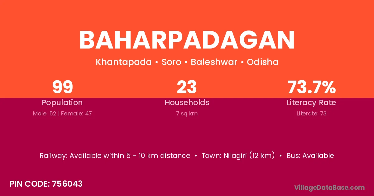 Nilagiri (12 km) is the nearest town to Baharpadagan village for major economic activities and is located approximately 12 km away.